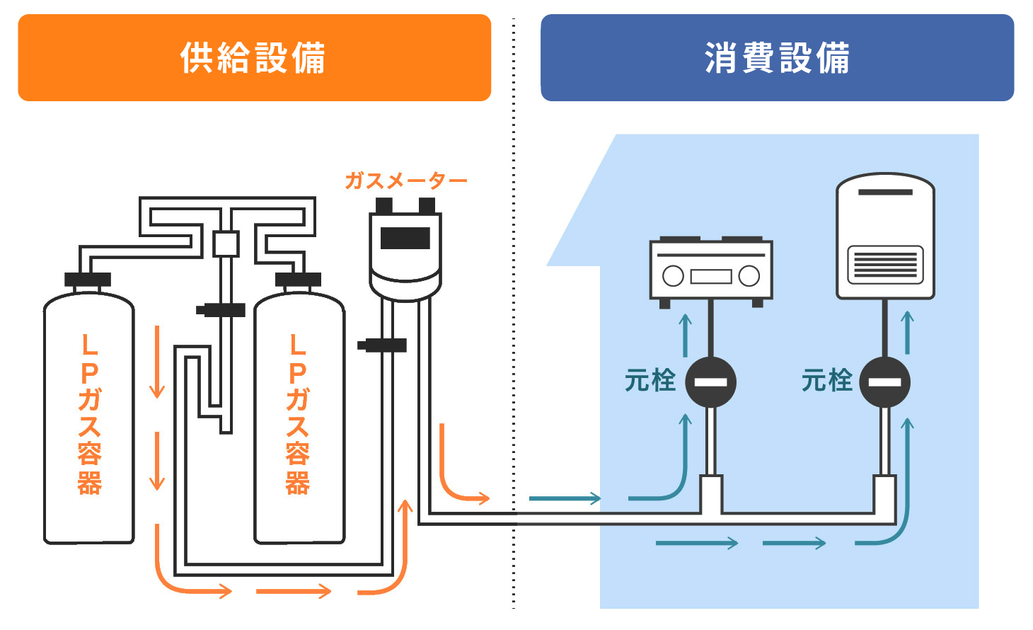 容器からガスメーターまでは「供給設備」と呼ばれ、この部分はLPガス販売店が責任をもって安全管理します。